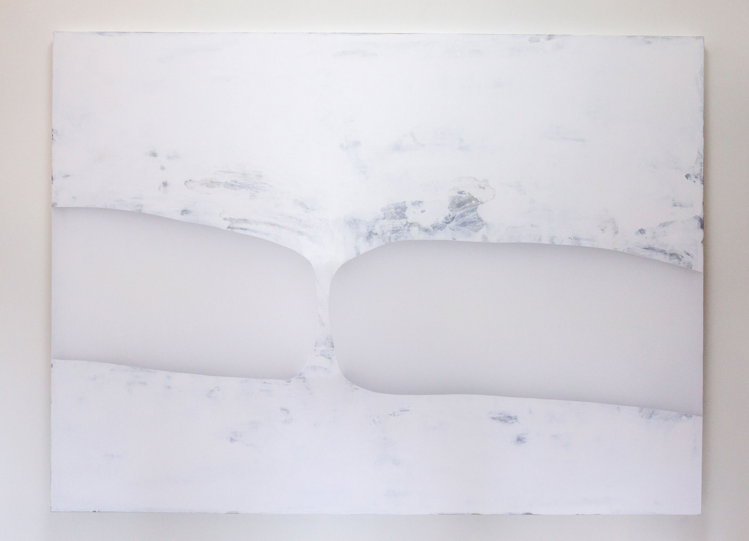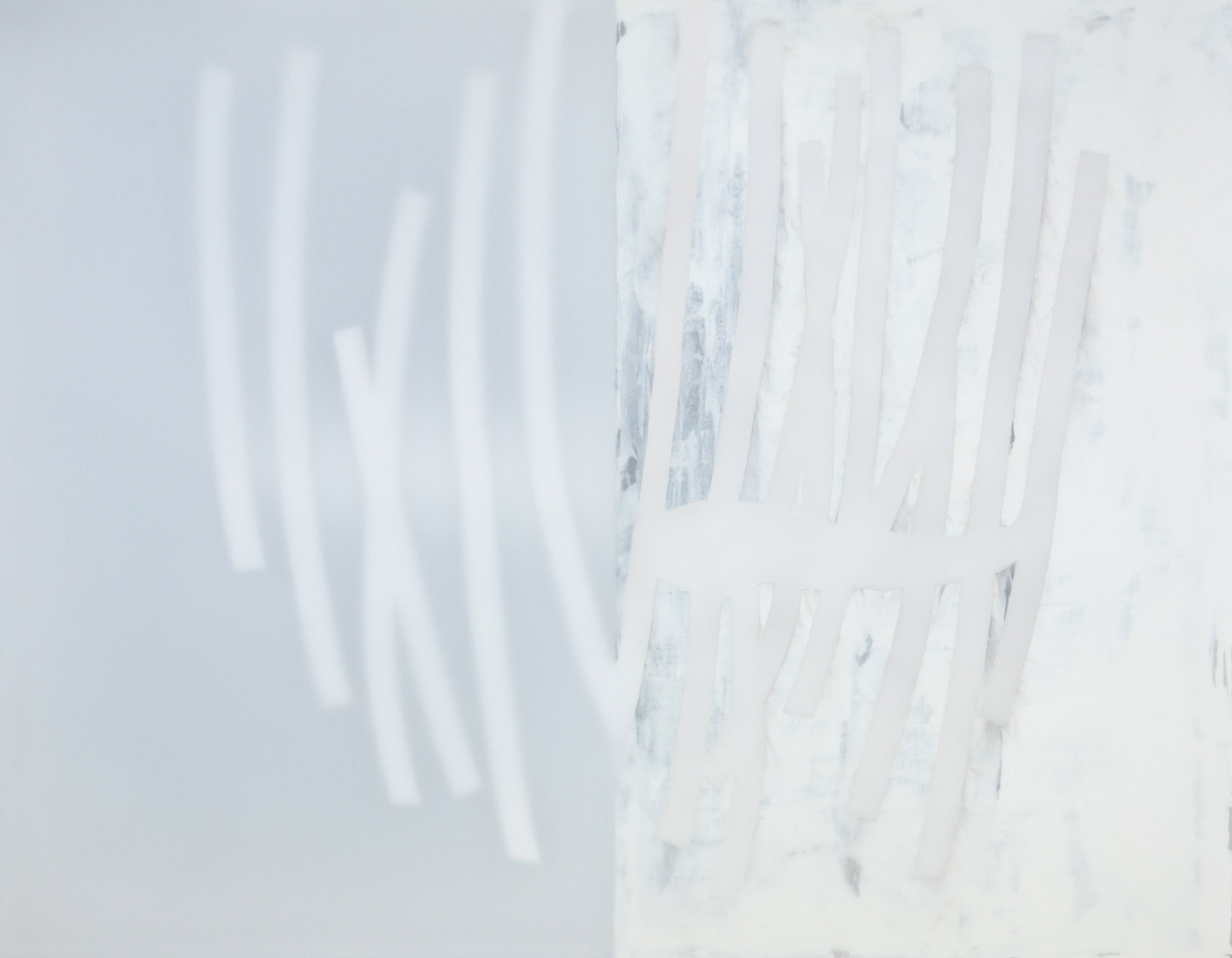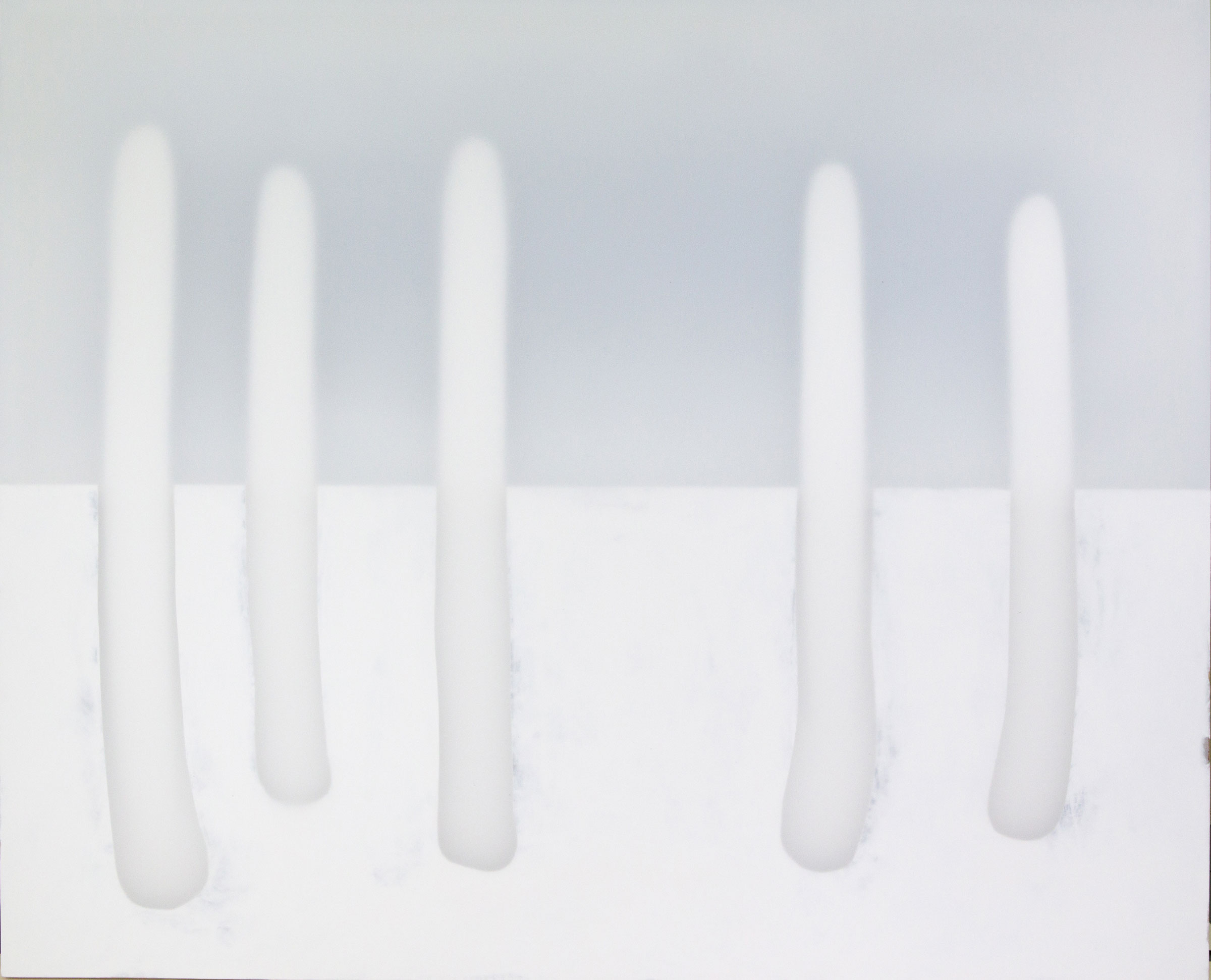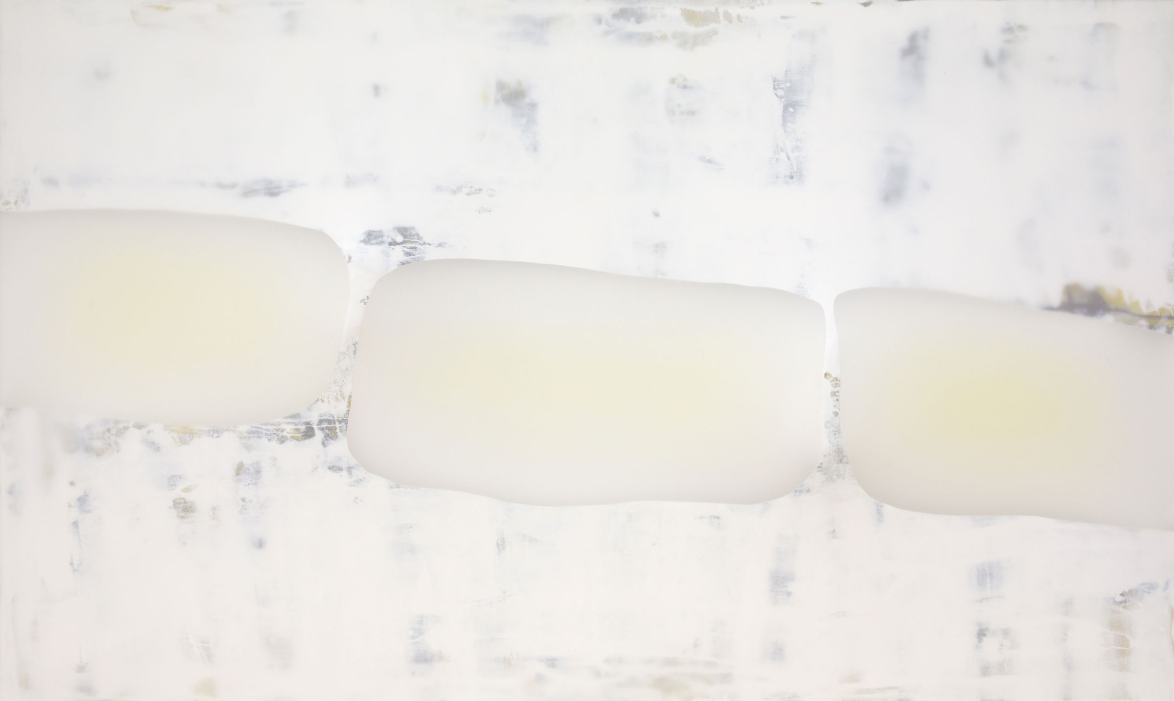 Die ca. acht Zentimeter tiefen monochromen Tafelbilder, zusammengesetzt aus Holz, Tuch, Leinwand, Flüssigkeiten und unbunter Farbe, scheinen auf geheimnisvolle Weise aus sich selbst heraus zu leuchten. Die Lichtquelle wirkt, als läge sie hinter dem Motiv und forme eine Art Silhouette.