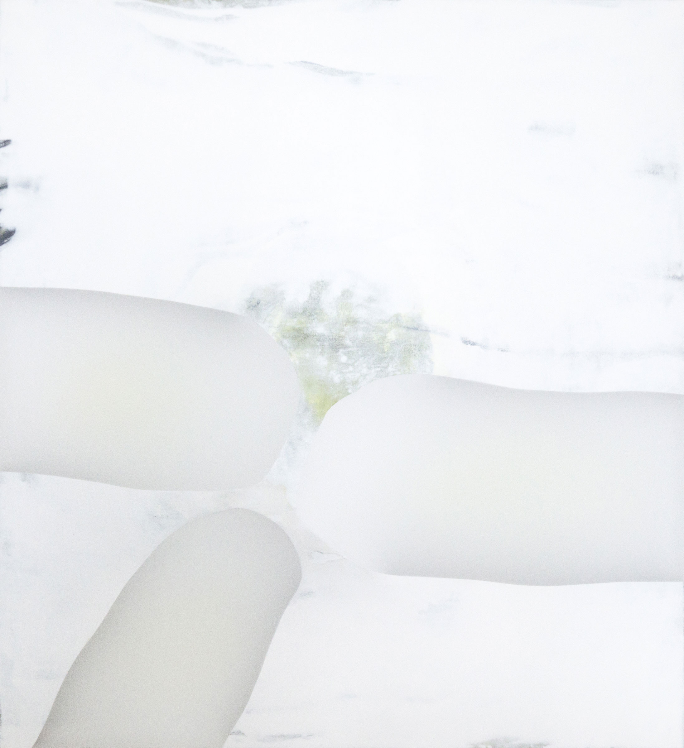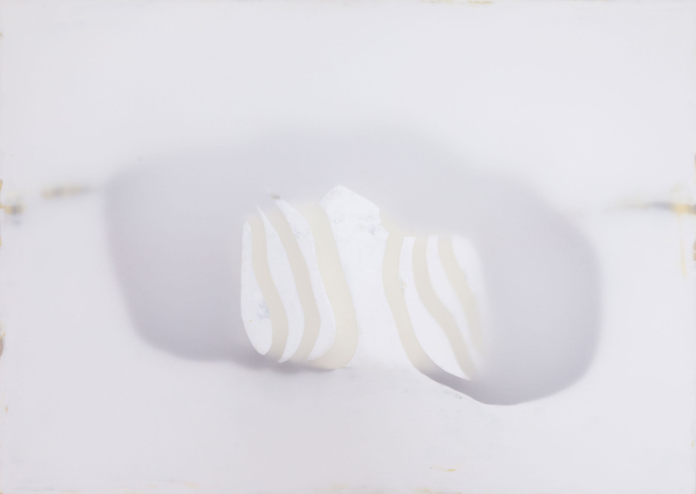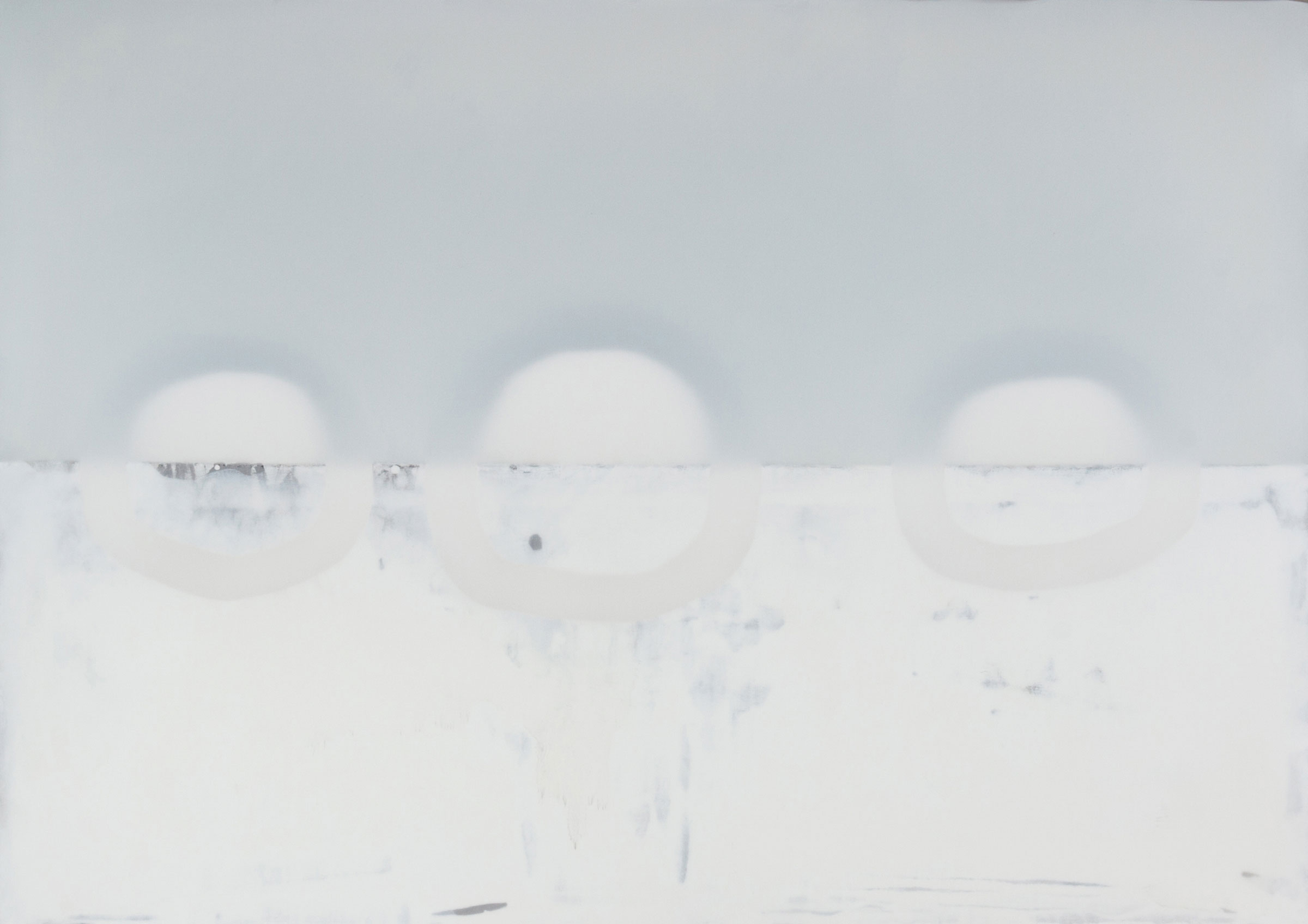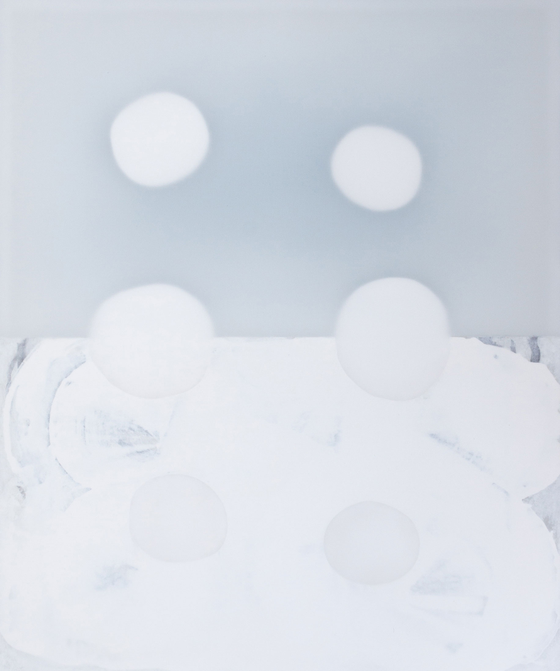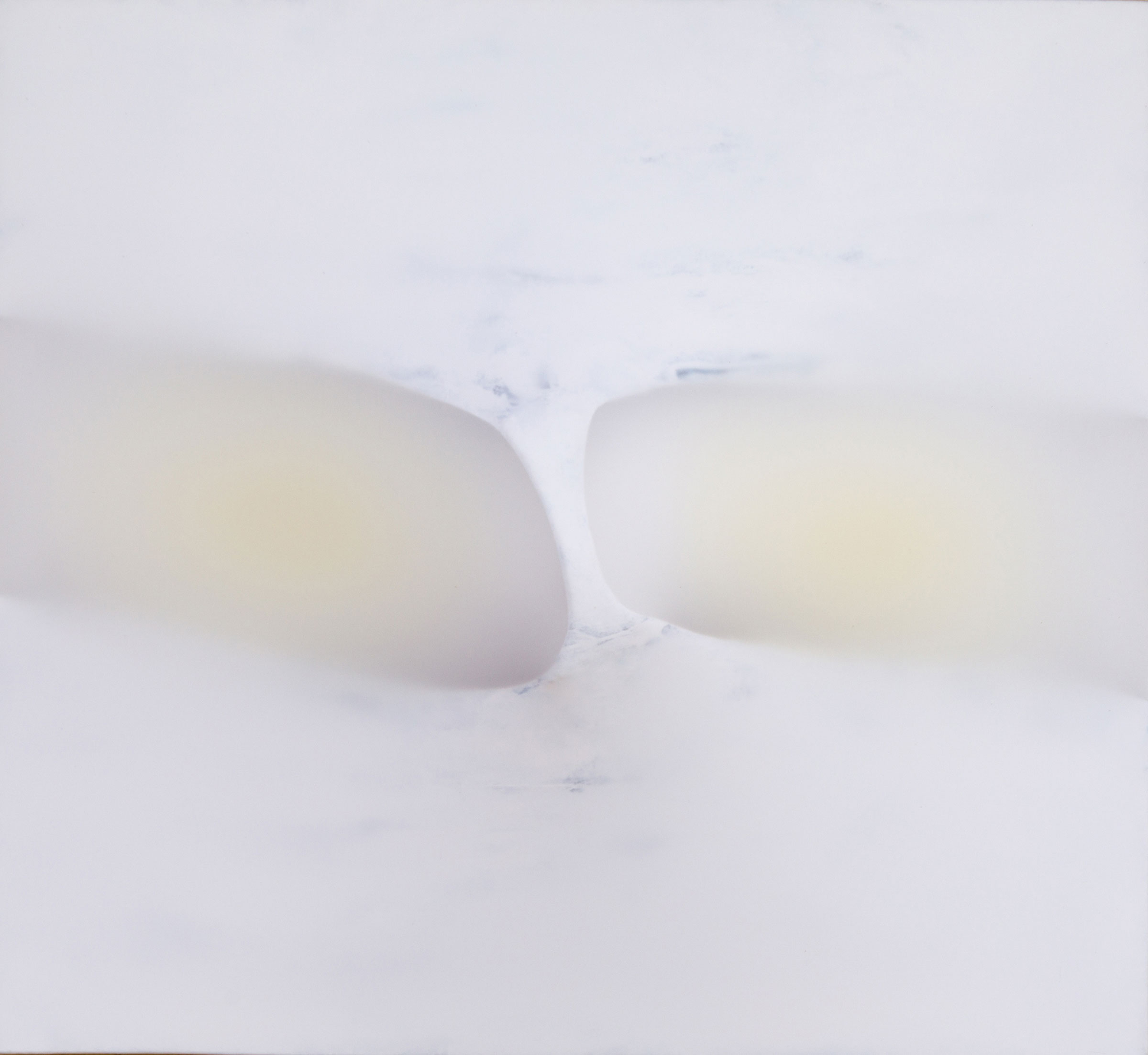Die ca. acht Zentimeter tiefen monochromen Tafelbilder, zusammengesetzt aus Holz, Tuch, Leinwand, Flüssigkeiten und unbunter Farbe, scheinen auf geheimnisvolle Weise aus sich selbst heraus zu leuchten. Die Lichtquelle wirkt, als läge sie hinter dem Motiv und forme eine Art Silhouette.